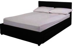 A contemporary upholstered leather effect bed frame with drawer storage. Part of the Heston collection. Leather effect frame. Base with wooden slats. Size W141, L203, H87cm. Drawer size W160, D53cm....