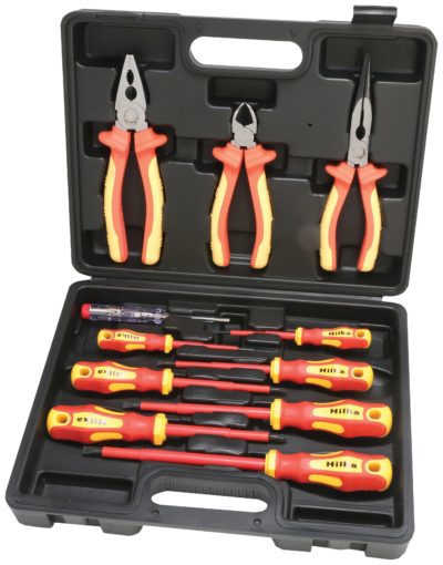 Fully insulated 11 piece VDE screwdriver and plier set tested to 1000 volts with soft grip handles. Includes 7 screwdrivers, 1 voltage tester and 3 pliers packaged in storage case. Fully insulated and tested to 1000 volts with soft grip handles. Packed in sturdy storage case. Voltage tester. Includes 7 screwdrivers, 1 voltage tester and 3 pliers packaged in storage case. Carry case.