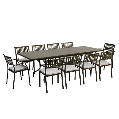 Seating up to 10 people, the Elisir extending table can be combined with the stackable Elisir Dining Chairs or Armchair, forming an elegant range of dining furniture that will grace your outdoor living space in classic style. Made from an all-weather mud-grey painted steel, the dining set is easy to maintain and can be left outside all year round. Better still, the frames are also rust resistance and have been painted with a solvent-free epoxy powder coating specifically designed for outdoor use. The high quality paint used does not contain any harmful or toxic substances either. This set contains: dining chairs (8), armchairs (2) and an extendible table. The Elisir furniture collection, inspired by classic design yet ready to meet all contemporary outdoor living needs, displays a timeless style with a complete and coordinated range, comprising lounge seats, dining chairs and extending tables, all in a warm and practical taupe painted finish with warm Nature White cushions. Please call find out more