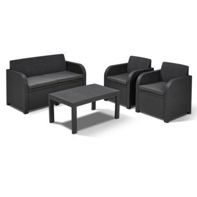 Keter Carolina Lounge Set - Graphite Relax in style while enjoying the view from your garden with this four piece lounge set comprising two chairs, two-seater sofa and coffee table. Perfect for gardens or conservatories, this rattan effect set is great for entertaining or unwinding on your own. Made from hard-wearing resin, it is sturdy and weather-resistant so you can leave it outside on rainy days, it's also UV and fade-resistant so you can enjoy it year after year. Set includes: 2 x chairs, sofa, coffee table. Chair dimensions: H77 x W67 x D65cm Table dimensions: H43 x W59 x D92cm Sofa dimensions: H77 x W67 x D129cm