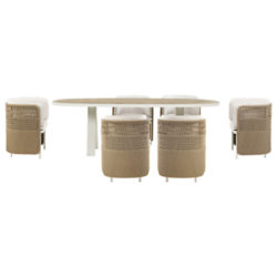Dining set influenced by semi-circular, architectural shapes Seats up to 6 people Curved seat-backrests FSC teak tabletop (weathered appearance) Sumptuous natural white upholstery and warm white...