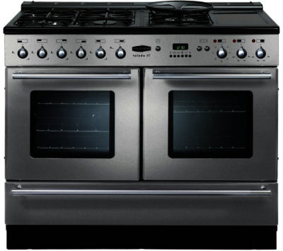 The 110 cm Rangemaster Toledo XT Dual Fuel Range Cooker in stainless steel and chrome offers impressive cooking power, two large ovens and a big gas hob to give you everything you need in the kitchen. It's also rated A for energy efficiency, helping cut household bills and reducing your carbon footprint. Multi-burner hob Enjoy the space and flexibility of five gas burners, which provide rapid heating and reliably hold your cookware with their cast iron pan supports. A multi-ring wok burner allows you to use larger cooking vessels so that you can rapidly prepare Asian-style meals and similar large dishes. A warming zone helps you keep dishes and cooked food warm for perfect serving. Use the cast aluminium griddle on the hob to cook food in different ways - sear steaks on the ribbed section and use the flat area for items like bacon or drop scones. Multifunctional oven The Rangemaster Toledo XT offers the benefit of a large 69-litre multifunctional main oven that allows you to achieve a wide range of cooking effects. Use fanned and conventional heat, base-only heat and fan-assisted heat to achieve superior control over any recipe. There's a browning element to give your dishes extra colour and texture for better presentation, and the defrost function helps you thoroughly and accurately prepare ready meals and frozen items for cooking. You'll get a further 69 litres of space in the second oven, which uses fanned heat for beautifully even temperature distribution - ideal for batch baking and more precise cooking overall. Built-in electric grill Take advantage of the Handygrill integrated with the main oven cavity on your Rangemaster Toledo XT . This full-width grill provides a great way to prepare food in a healthier way - explore different tastes, textures and colours by grilling different foodstuffs. Because the grill is part of the cooker's multifunction oven, it offers closed door and fanned grilling to give you enhanced control and reduced cooking times - perfect when you're making a large sit-down breakfast for friends or family. Keeping you organised in the kitchen The Rangemaster Toledo XT Range Cooker has a programmable timer that allows you to cook each meal exactly as you want it done, eliminating the risk of burning or undercooked food. Keep essential cooking items in the large storage drawer, helping you stay organised and ensuring you don't lose those accessories you really need. It slides out smoothly on easy-glide runners. Catalytic liners in each oven make for easy cleaning - they absorb fat spits and food spillages, oxidising any mess at around 220 degrees so that all you need to do is wipe away the residue once the oven's off and cooled down. Give yourself the options and power you need to cook the way you want with this 110 cm Rangemaster Toledo XT Dual Fuel Range Cooker in a stainless steel and chrome finish.