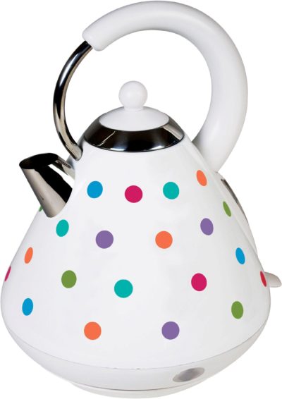 The KitchenOriginals Classic Bright Spot Kettle is hand printed with a contemporary polka dot design. Drawing influence from the traditional styles of a vintage kitchen and combining this design with on-trend colour palettes, this unique appliance is made from high quality stainless steel with a powerful fast boil heating element. 3 kW. 1.7 litre capacity. Rapid boil. Boil dry protection - automatically switches off when the kettle is empty. Removable and washable limescale filter. Pull off lid. 360 degree base.